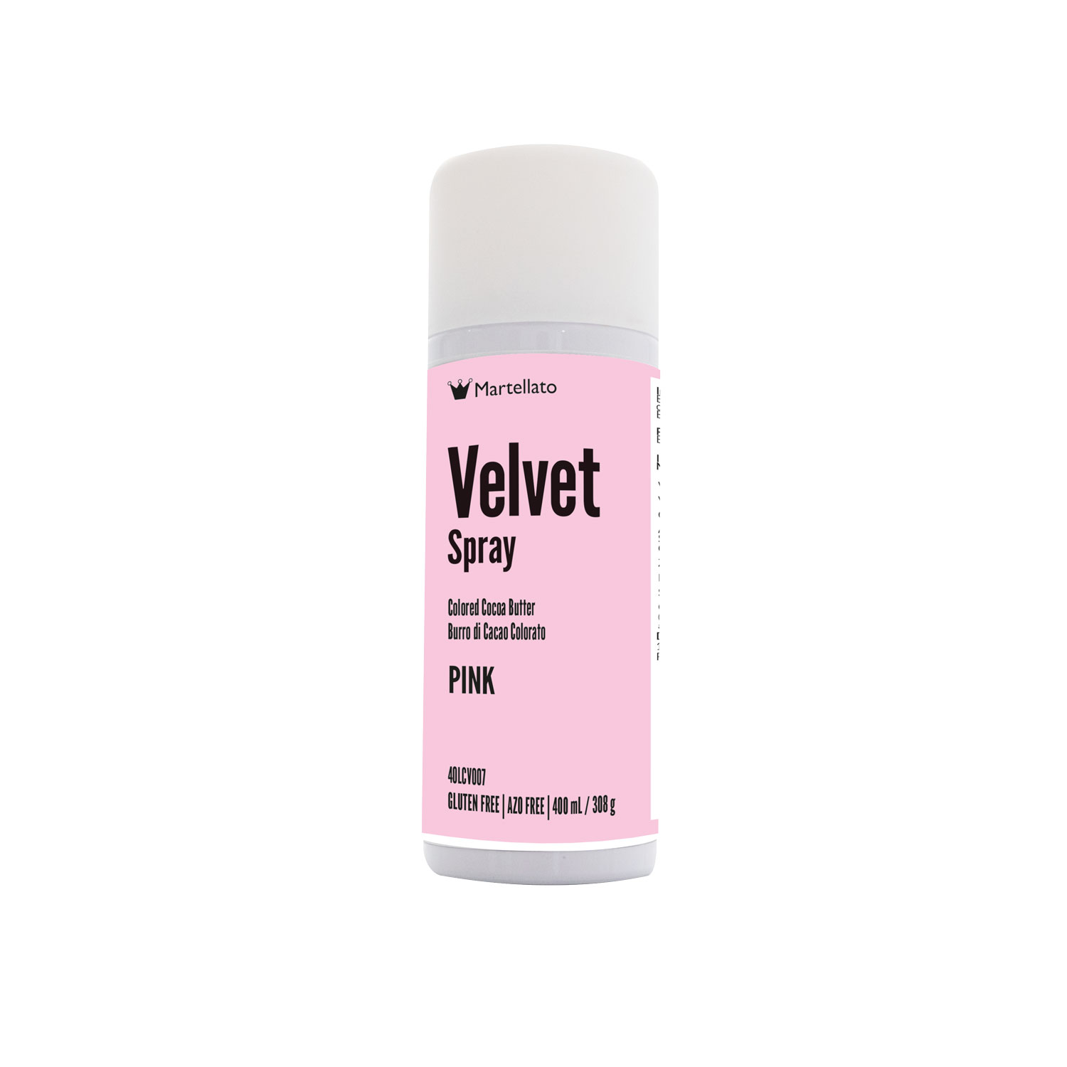 Rocíe con manteca de cacao rosa para conseguir un efecto terciopelo. El producto debe pulverizarse sobre una superficie fría/congelada. Por ejemplo, parfaits, helados, mousse y chocolate. De este modo, la manteca de cacao cristaliza y crea el efecto aterciopelado deseado.