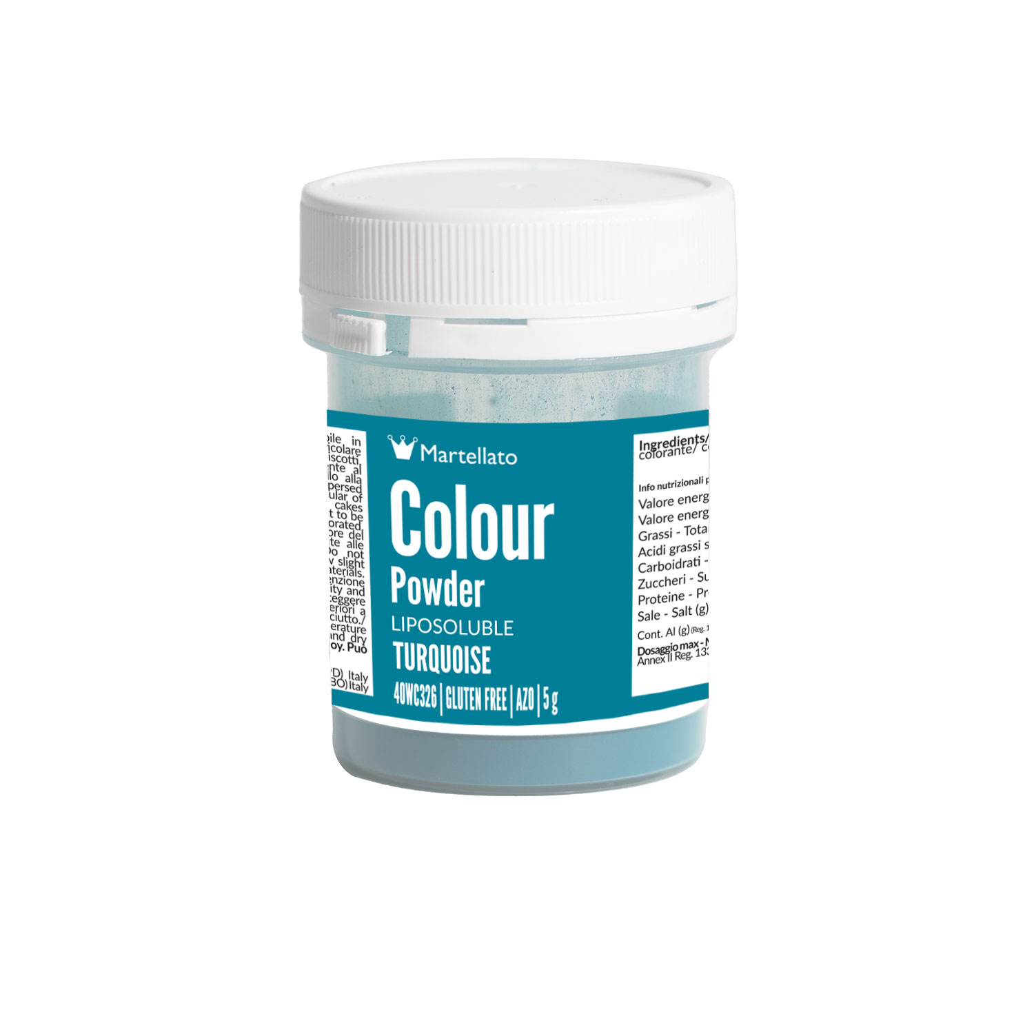 Colorante en polvo liposoluble turquesa adecuado para la coloración en masa de productos a base de grasa, como manteca de cacao, chocolate blanco, crema de mantequilla, pasta de almendras, pasta de azúcar, parfaits. Puede utilizarse sobre la superficie con pincel tal cual, diluirse con alcohol o goma laca líquida y luego pincelarse directamente sobre la superficie a decorar.
