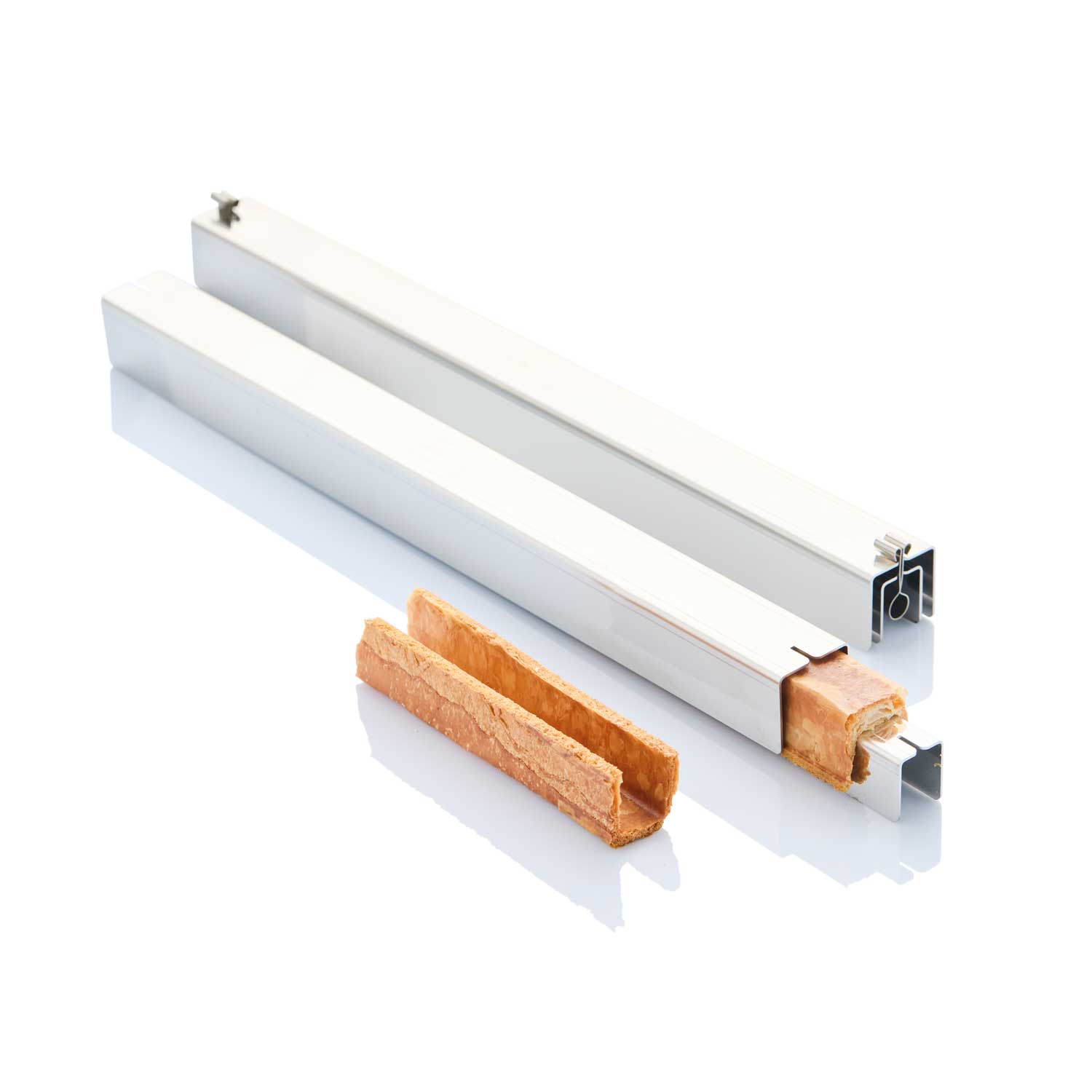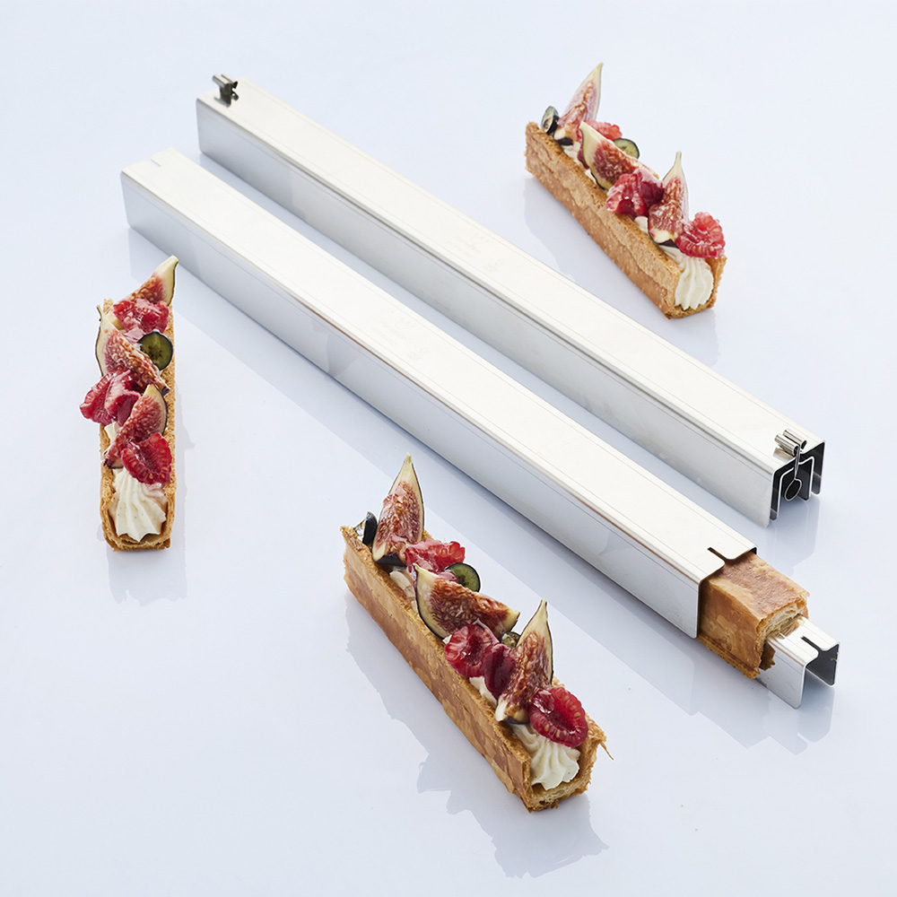 Fabricado en acero inoxidable, Croissant Bar es el innovador molde compuesto por dos barras en forma de U que encajan entre sí y se bloquean mediante dos ganchos laterales, lo que garantiza la máxima estabilidad durante la cocción.