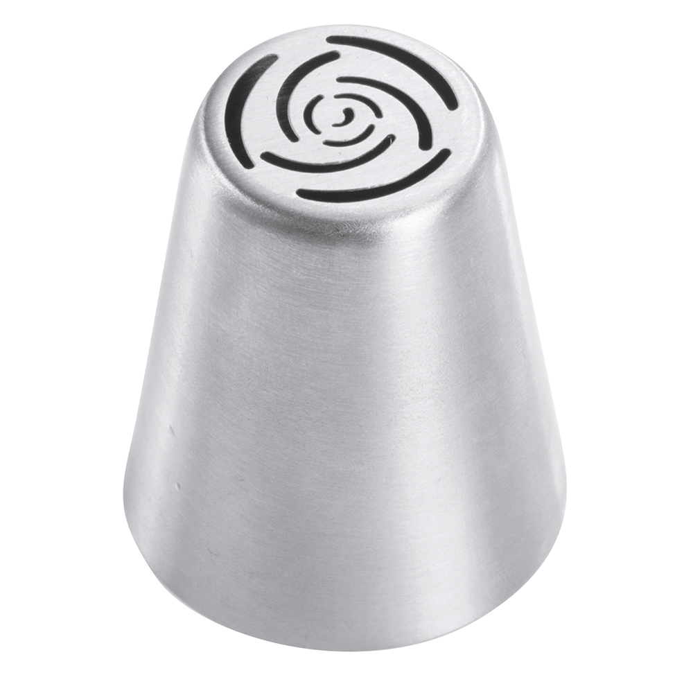 Boquilla de acero inoxidable para sac à poche o manga pastelera con elaborada forma floral. Esta boquilla no tiene costuras, lo que garantiza una descarga uniforme del producto y una gran resistencia.
