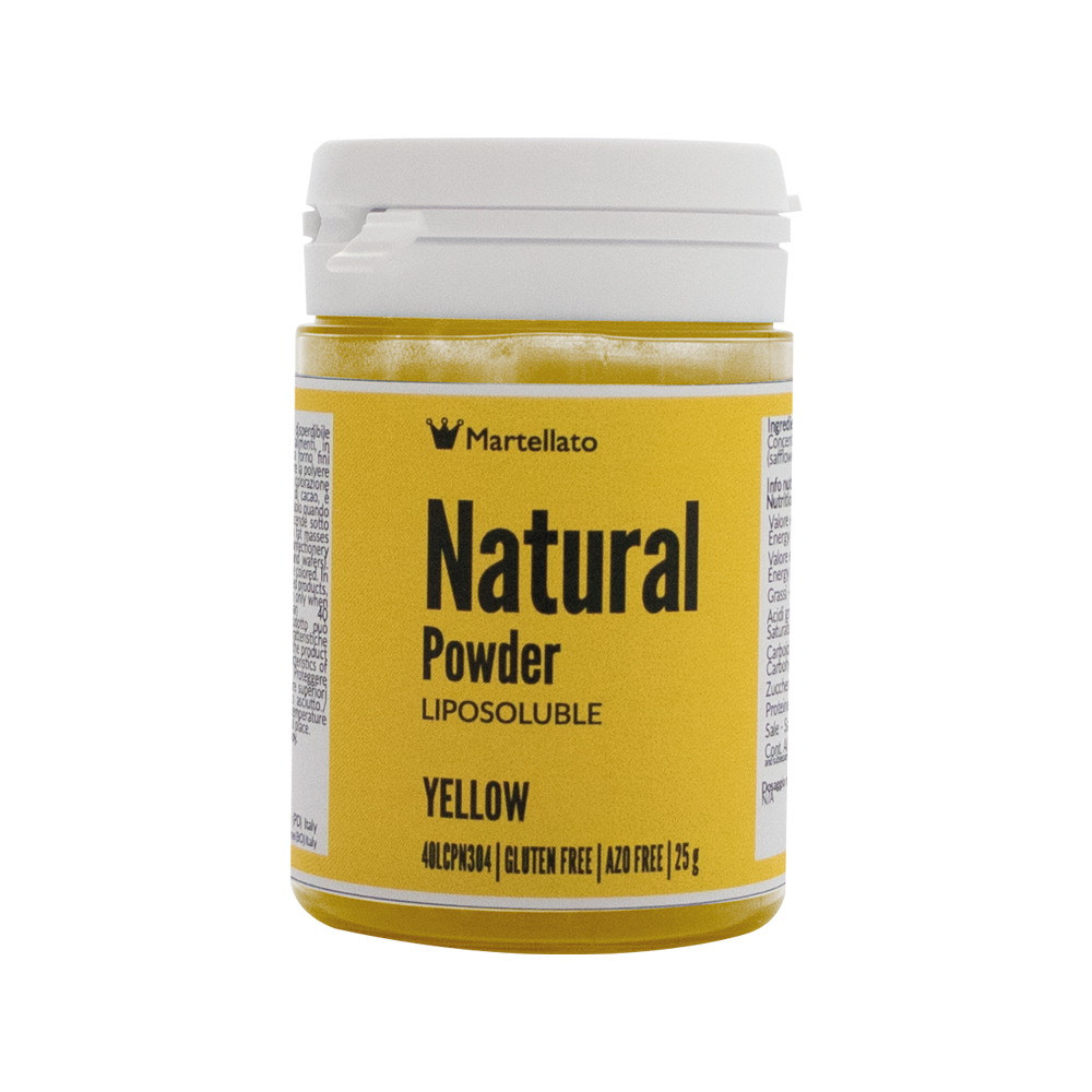 Colorante alimentario amarillo natural en polvo liposoluble adecuado para la coloración en masa de productos a base de grasa, como chocolate, crema de mantequilla, pasta de almendras, parfaits de pasta de azúcar.