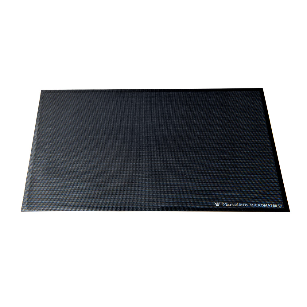 Tapete de cocción profesional de silicona microperforada con núcleo de fibra de vidrio Micromat, utilizable durante la cocción o la congelación, para diversos productos de pastelería como galletas, éclairs, masas de cocción, pan, etc. Los microagujeros permiten que el calor se transmita uniformemente por todo el producto, garantizando una cocción óptima de las superficies superior e inferior. El tapete de silicona para cocinar es apto para el lavavajillas, antiadherente y antideslizante.
